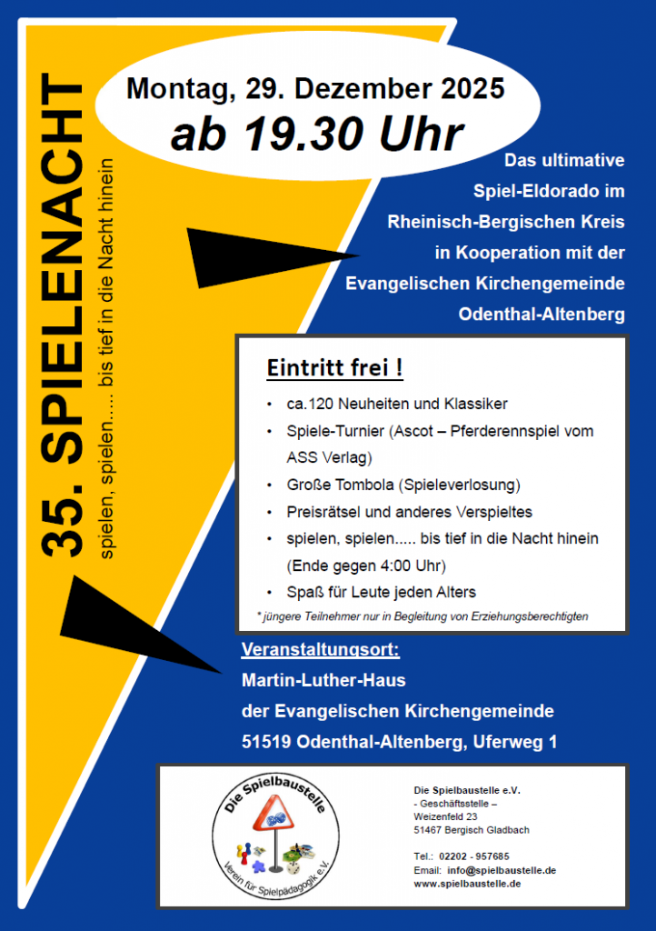 Ende des Jahres findet wieder die Große Spielenacht der Spielbaustelle e.V. in Odenthal-Altenberg statt.