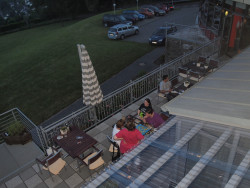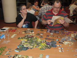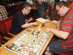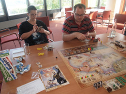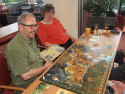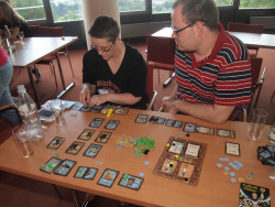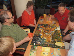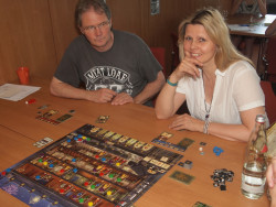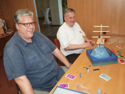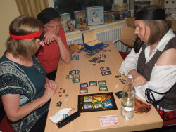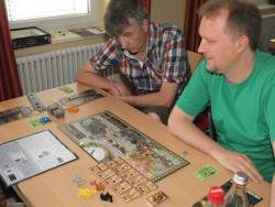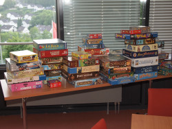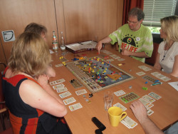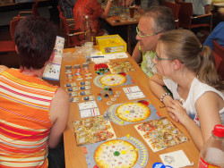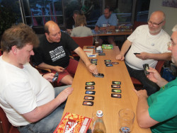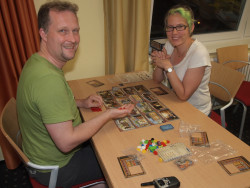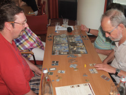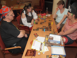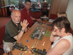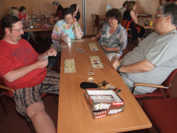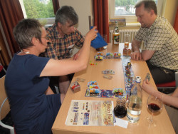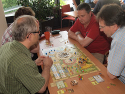 Trotz Umleitungen unfallfrei in Bergneustadt angekommen, wurden wir im Ort mit gespannten Fähnchen quer über den Straßen begrüßt. Oder war die Stadt gar nicht für uns geschmückt? Kein sein, denn zeitgleich mit unserem Spiele-Event war dort Kirmes. Egal, war auf jeden Fall ein netter Empfang bei strahlendem Sonnenschein, welcher bis auf ein kleines Unwetter am Montag nicht nur die Spieler zum Schwitzen brachte. Auf jeden Fall war die große Veranda mit Spielen und Spielern nahezu durchgehend belegt.