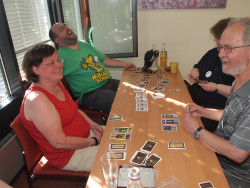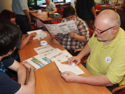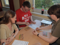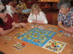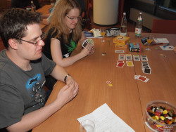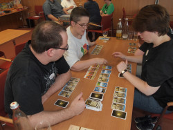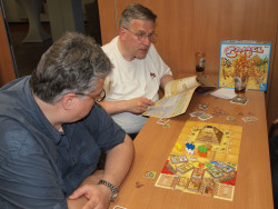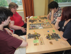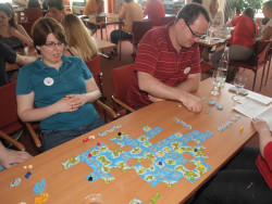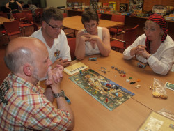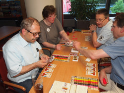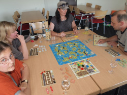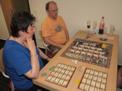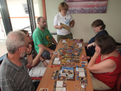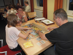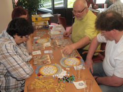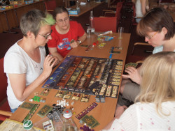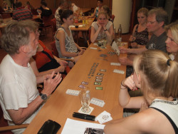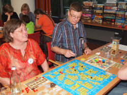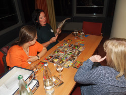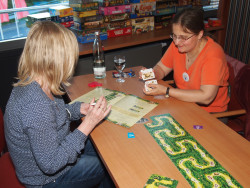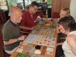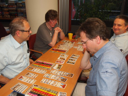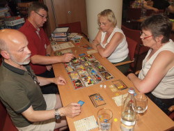 Nach großem Hallo, einer informative Begrüßung durch die Phönix-Spiele-Crew und die neue Vereinsvorsitzende Inge Mettmann, ging es endlich ums Eigentliche: Das Spiel oder besser: Die Spiele – denn die waren dank der Unterstützung vieler Spieleverlage wieder reichlich vorhanden. Das Angebot wurde gut genutzt und einer kritischen Prüfung unterzogen. Diese gipfelte dann in der Bewertung für die neue Spiele-Hitliste der Spielbaustellen-Reisen.