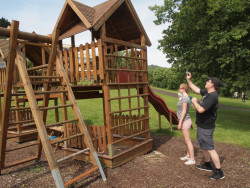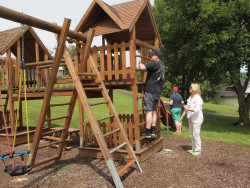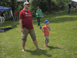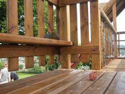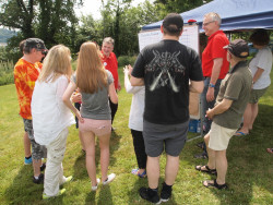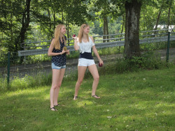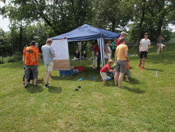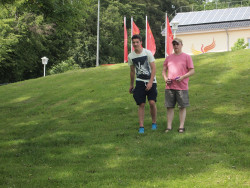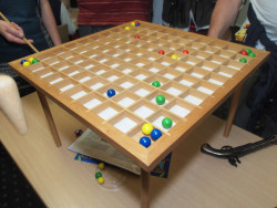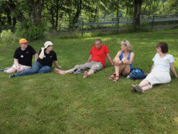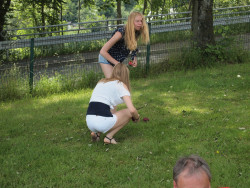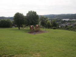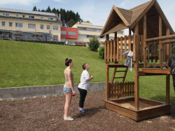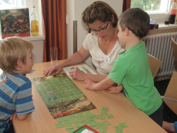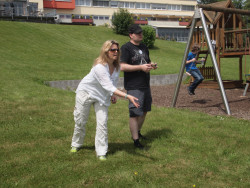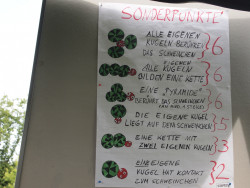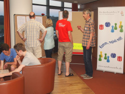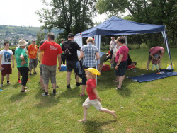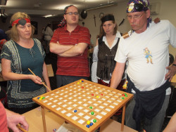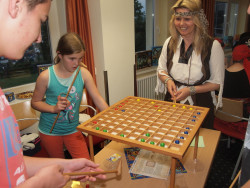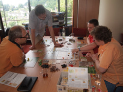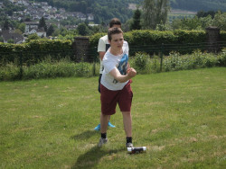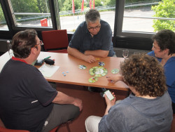 Ganz neuen Herausforderungen mussten sich die erfahrenen Spielereisenden in diesem Jahr beim immer beliebter werdenden Outdoor-Event stellen: Noch sind nicht alle Möglichkeiten des schönen neuen Hotels erkundet, schon reizt am Samstagnachmittag die wunderschöne Außenanlage, eine grüne Wiese mit Klettergeräten und faszinierender Aussicht auf das Oberbergische Land . Da kommt natürlich nur eine zünftige Partie Cross-Boule (Zoch) in Frage, welche über drei Stunden die 30 Teilnehmer/innen in alle Höhen und Tiefen des Geländes führte. Für die flexiblen Crossboules (Stoffsäckchen in tollen Designs) gibt es keine Hindernisse: selbst die Hängebrücke auf dem Spielplatz wird als Zielort gewählt. Da das Wetter (35 Grad im Schatten) ebenfalls sein Bestes gibt, verbringen alle einen spannenden Nachmittag.